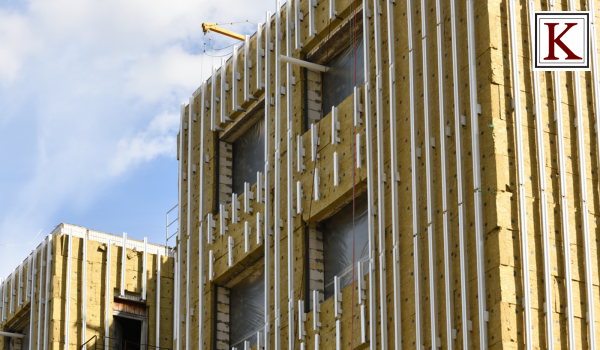 Fire-treated blocking, plywood sheathing, DensGlass, building wrap and insulation.